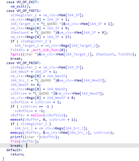 The VM consists of 20 variable length instructions since the switch statement has only 20 cases if we don’t count the default case. The instructions that immediately stick out are VM_OP_EXIT, VM_OP_FGETS, VM_OP_PRINT due to their calls to EXIT(), FGETS() and PRINTF() as well as the logical operations AND, NOT, OR, XOR since these handlers perform said operations on 2 operands and store the result of those somewhere. These operations stick out especially because, not only are they common but could also be a part of the key checking logic.