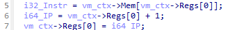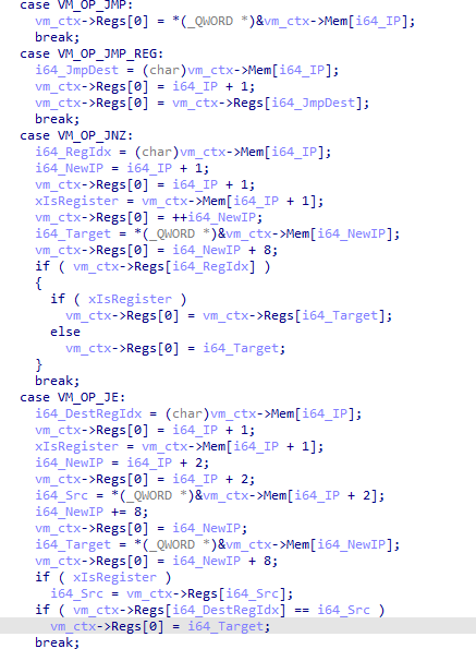 With the help of that discovery I managed to uncover the instructions VM_OP_JMP, VM_OP_JMP_REG, VM_OP_JNZ and VM_OP_JE since these directly modify the instruction pointer:
