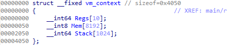 With the instruction pointer and stack structures discovered, the behaviour of the remaining opcodes is easily understood, therefore I moved on to the other functions of the binary. Starting with the main function, it first creates an object of the VM-context structure and clears its contents.