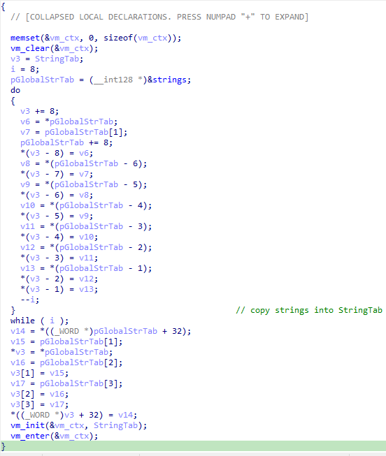 Next, in the “vm_init” function, the virtualized code is copied into memory of the VM-context structure, the instruction pointer is set to 0x38D and the stack pointer is set to 0. Finally it calls the “vm_enter” function, which starts an infinite loop that executes a single opcode at a time using the “vm_interpreter” function.