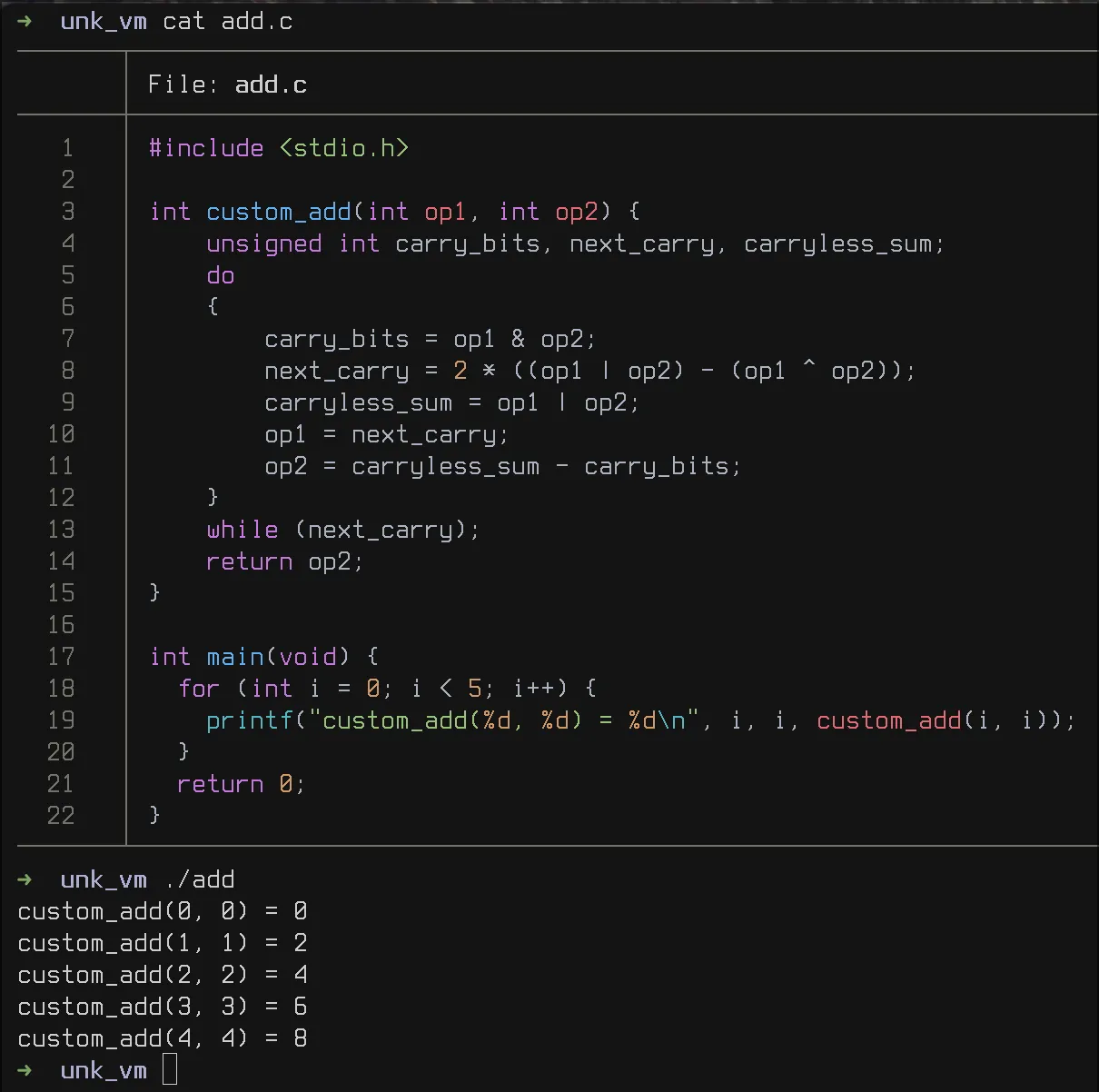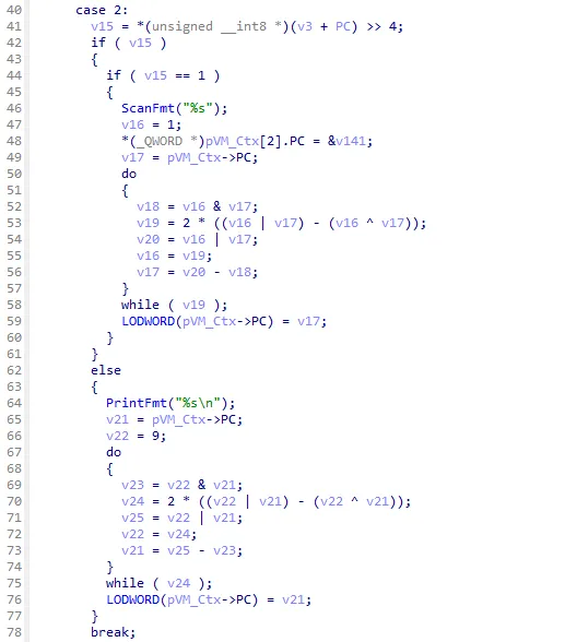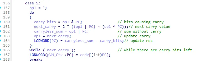 The next thing that caught my attention were the do-while loops in every instruction-handler of the switch-case. I discovered the purpose of this code block by copying the do-while loop into an empty file and rewriting the block as a function, which takes the missing variables v21 and v22 as an argument because these values differ in every occurrence of this snippet in the decompiler. In the main function I made a simple for-loop which calls the function with some simple values and finally compiled the program. Upon compiling the snippet, the function seemed to always return the sum of the passed in values, thus I concluded it is likely a binary adder implementation.