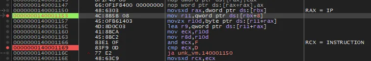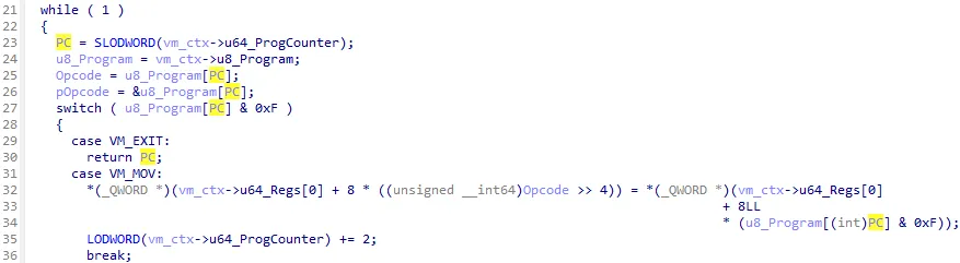 After understanding all the opcode handlers, I decided it was time to debug the binary. Therefore in IDA, I first located the addresses on which the pointer of the virtualized code and the virtual machine’s program counter is loaded into registers. I managed to accomplish this by, again, synchronizing the decompiler view with the disassembly view.
