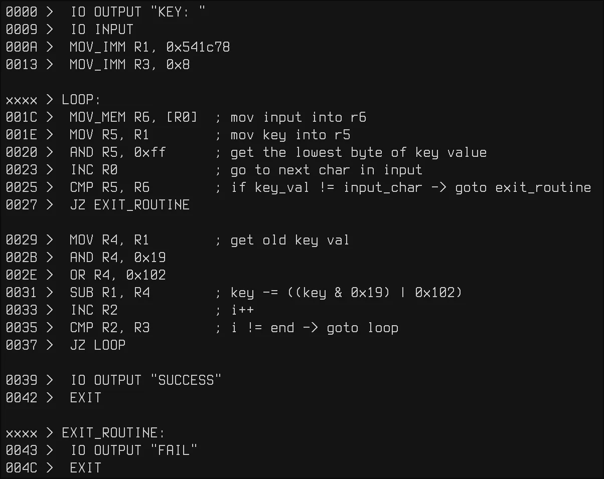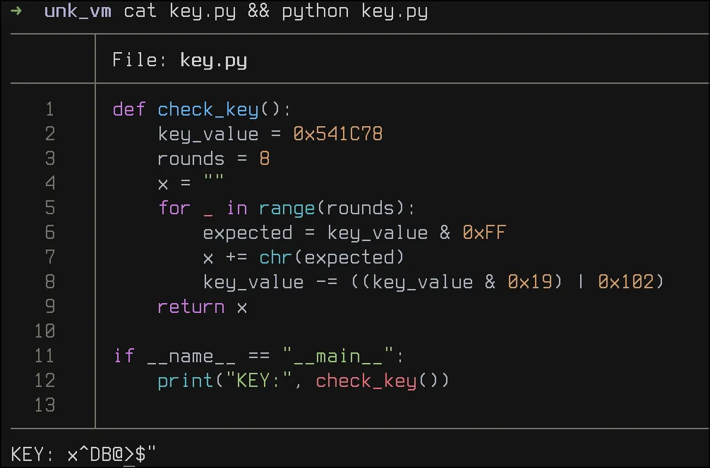 As we can see, the key checking routine compares each character of our input with a key that mutates on each iteration of the loop. To get the key, I implemented the key-check routine in python and got the following output: