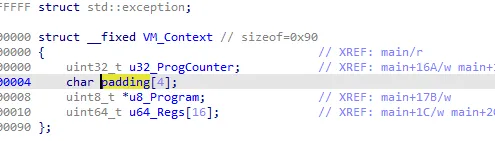 Running the script and opening IDA again, I managed to quickly find the VM_Context structure along with the instruction pointer that was being updated in every instruction handler of the switch-case statement. The VM_Context structure consists of a 32-bit wide instruction pointer, a pointer to the virtualized code and 16 64-bit wide registers.