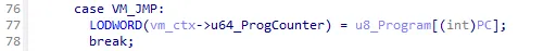 Additionally, I quickly found the VM_JCC instructions along with the VM_JMP instruction as its instruction handler only set the instruction pointer to the given value.