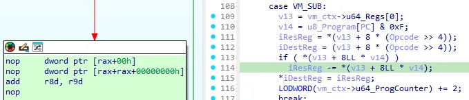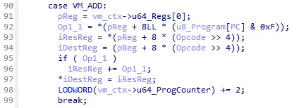 Following that I also discovered the VM_ADD and VM_SUB operations due to the quite obvious add operation in the if-statement in both. Since those handlers also referenced something at an unknown offset in the VM_Context structure, I added an array of length 0x10 to the VM_Context structure of the type uint64_t and labeled it “regs”.